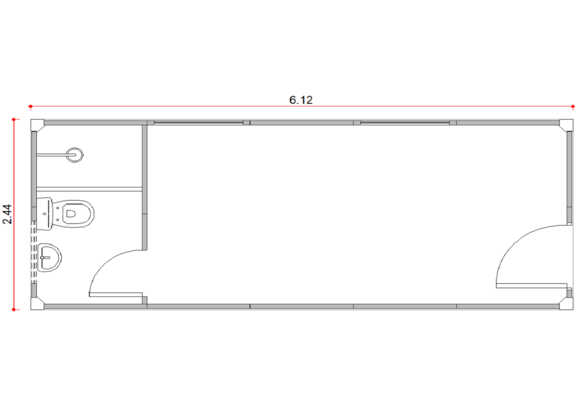Módulo Habitável série CE com paredes em termo painel medindo 6,12 x 2,44 x 2,85m (C x L x Aext), contendo 01 porta externa com fechadura, 02 janelas laterais com vidro do tipo deslizante, 01 ponto físico para condicionador de ar, instalação elétrica (03 tomadas, 02 interruptores conjugados, 01 ponto para chuveiro quente, 03 luminárias de LED, 01 exaustor e 01 quadro elétrico), 01 ponto físico para rede lógica (sem cabeamento), 01 porta interna com fechadura, 01 vaso sanitário, 01 chuveiro frio, 01 papeleira, 01 saboneteira, 01 pia lavatória e piso em manta vinílica ou grão de arroz.